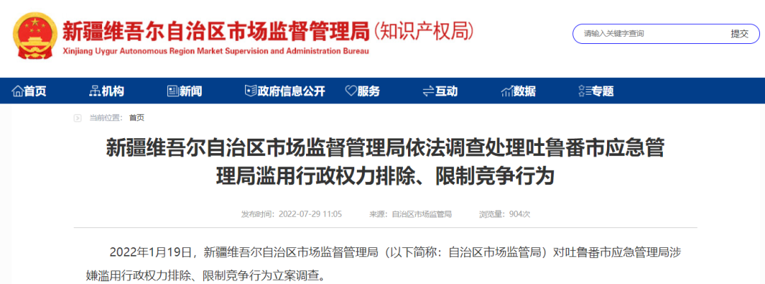 2022年1月19日,新疆維吾爾自治區(qū)市場監(jiān)督管理局(以下簡稱:自治區(qū)市場監(jiān)管局)對吐魯番市應急管理局涉嫌濫用行政權(quán)力排除、限制競爭行為立案調(diào)查。